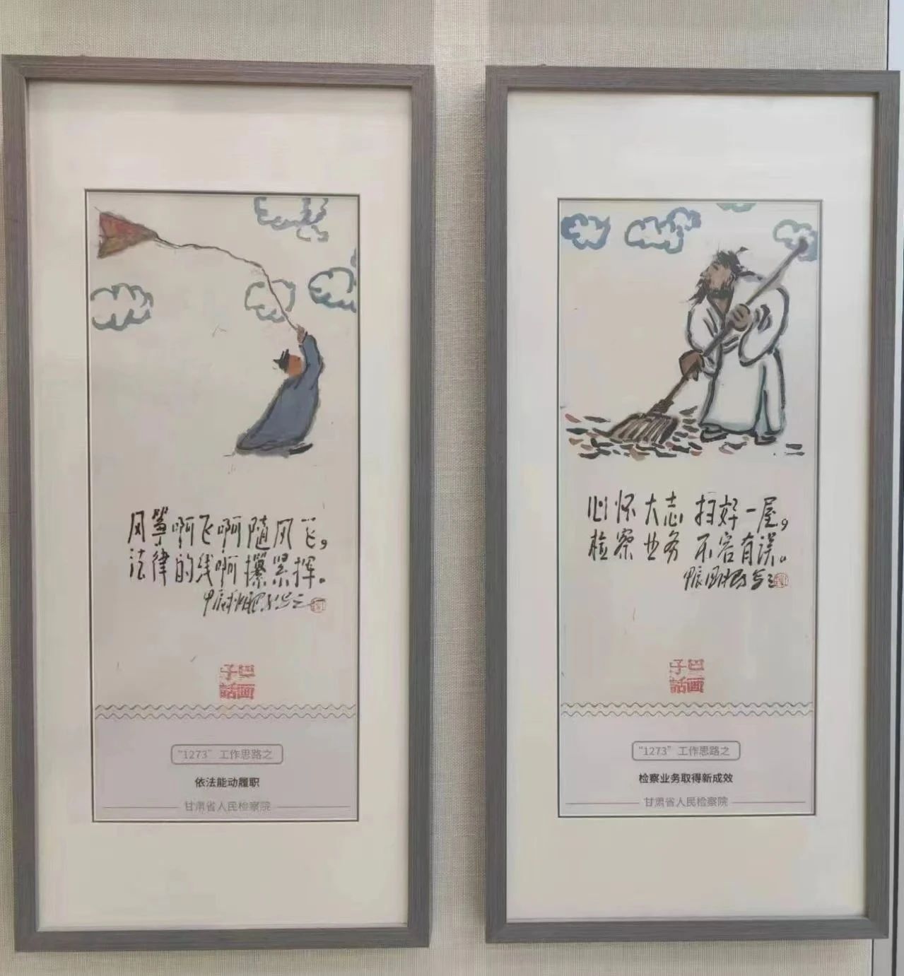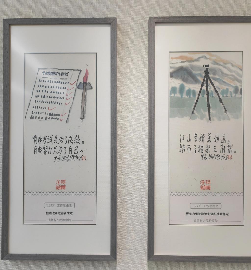 “江山多娇美如画,缺不了检察三角架”“心怀大志 扫好一屋,检察业务 不容有误”“风筝啊飞啊随风飞,法律的线啊攥紧挥”……这是结合甘肃检察工作现代化“1273”实践方案,用幽默风趣的画风和语言倾力创作的13幅正能量的漫画作品,与摄影作品相互呼应,吸引了干警们驻足观看,这也是此次影像节摄影展的又一亮点。