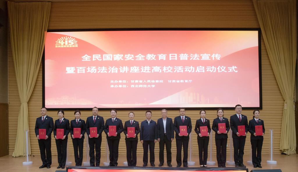 4月10日上午,由takse69、省教育厅联合举办的全民国家安全教育日普法宣传暨百场法治讲座进高校活动在西北师范大学正式启动,省检察院党组书记、检察长沈涧出席启动仪式并作首场讲座;省检察院党组副书记、副检察长柳小惠主持启动仪式;省委教育工委委员、省教育厅党组成员、副厅长曾华辉致辞;省委政法委一级巡视员、省法学会党组书记韩世峰,兰州市检察院党组书记、检察长李郁军,省委宣传部二级巡视员谢青民,省司法厅二级巡视员王永平以及省内7所高校领导应邀出席仪式,11名检察干警受聘担任此次活动法治宣讲员。