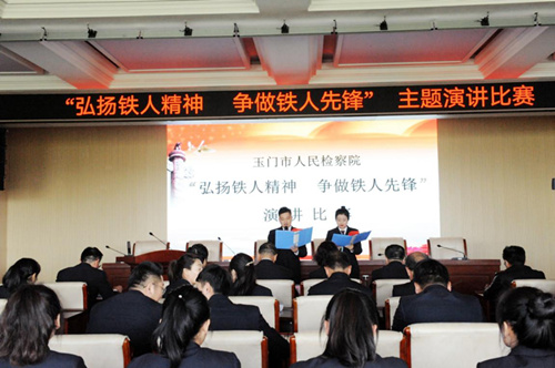 在纪念铁人王进喜逝世50周年之际,为缅怀铁人事迹,弘扬铁人精神,引导广大检察干警争做铁人先锋,不断增强推动玉门检察工作全面发展的历史责任感和使命感。10月20日,玉门市院组织开展了以“弘扬铁人精神、争做铁人先锋”为主题的演讲比赛,共有12名检察干警参加了比赛。