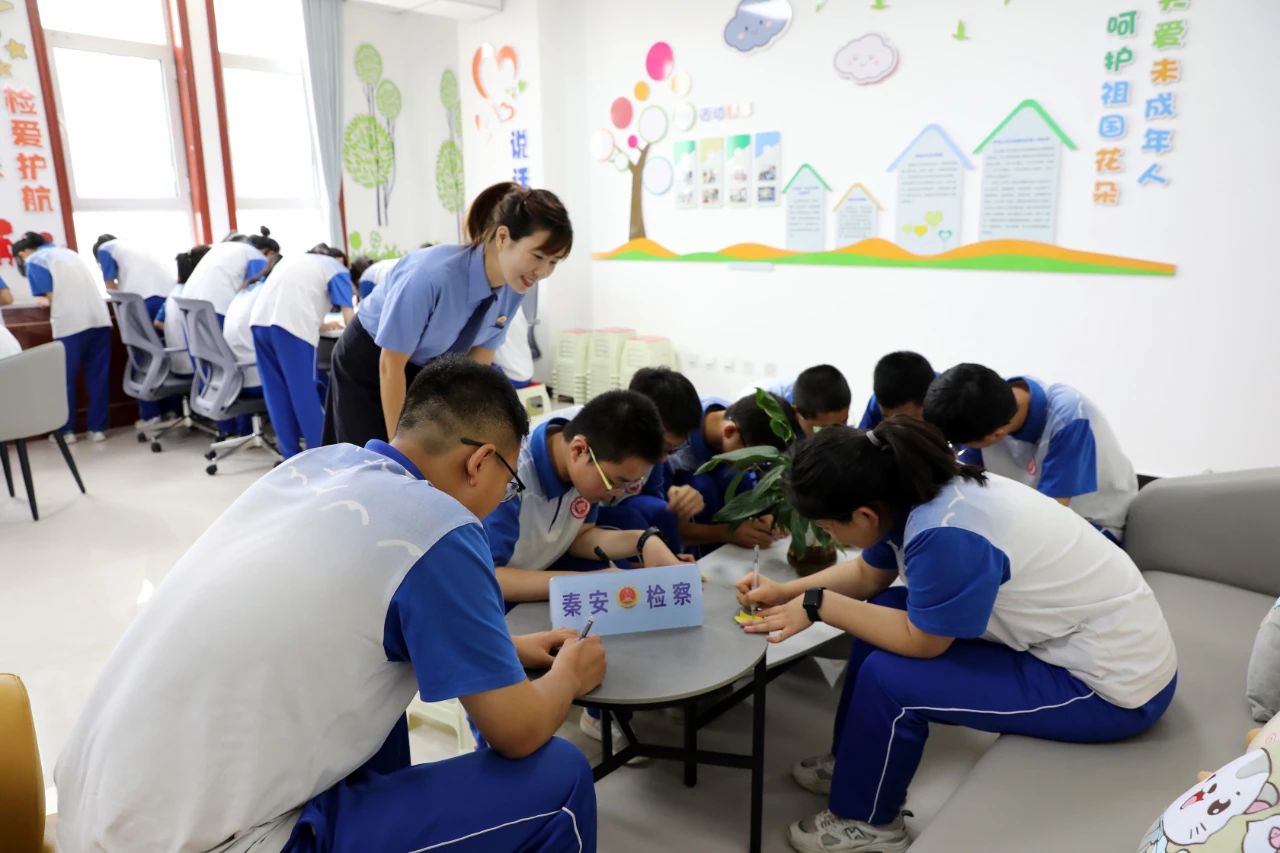 同学们先后参观了秦安县检察院一楼大厅展板区、12309检察服务中心、检察听证室、智慧检务中心、“小禾苗”未检工作室等,体验了检察官的办案环境和工作日常。在“小禾苗”未成年人检察工作室,检察官通过一场别开生面的法治小课堂,用生动的案例讲解和互动问答,为同学们诠释了法律护佑成长的意义。同学们全神贯注地倾听,学习了保护个人隐私、抵制校园欺凌等安全防护知识;观看了青少年普法微视频,并在书签上写下自己的小愿望及参加活动的感受。