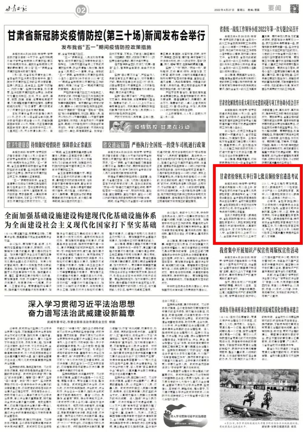2022年4月27日,甘肃日报二版刊发新闻《甘肃省检察机关举行第七批员额检察官遴选考试》。