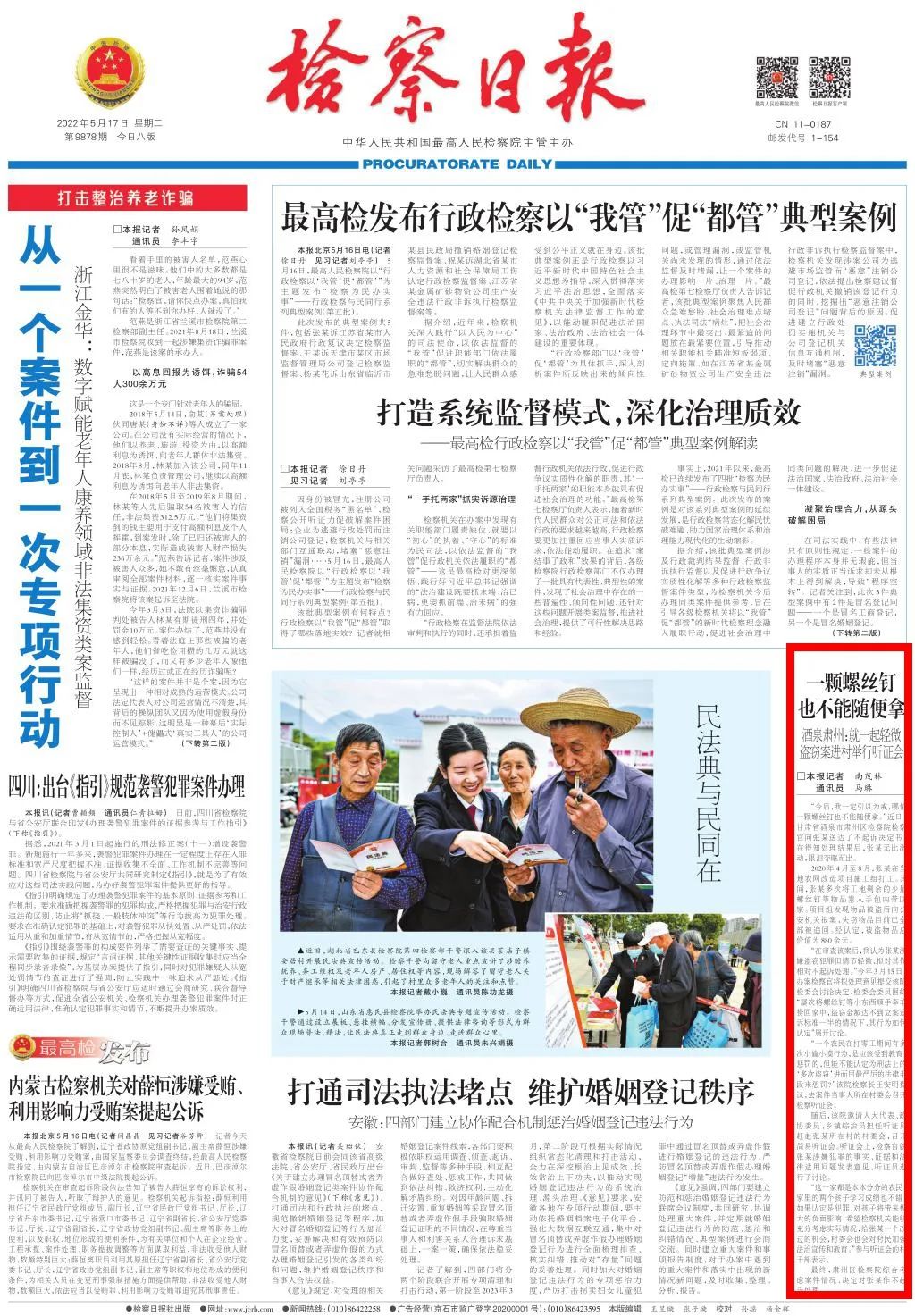 头版刊发《一颗螺丝钉也不能随便拿——酒泉肃州:就一起轻微盗窃案进村举行听证会》。