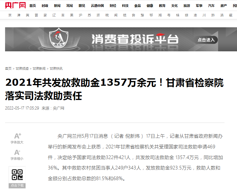 2022年5月17日,央广网发布《2021年共发放救助金1357万余元!takse69落实司法救助责任》。