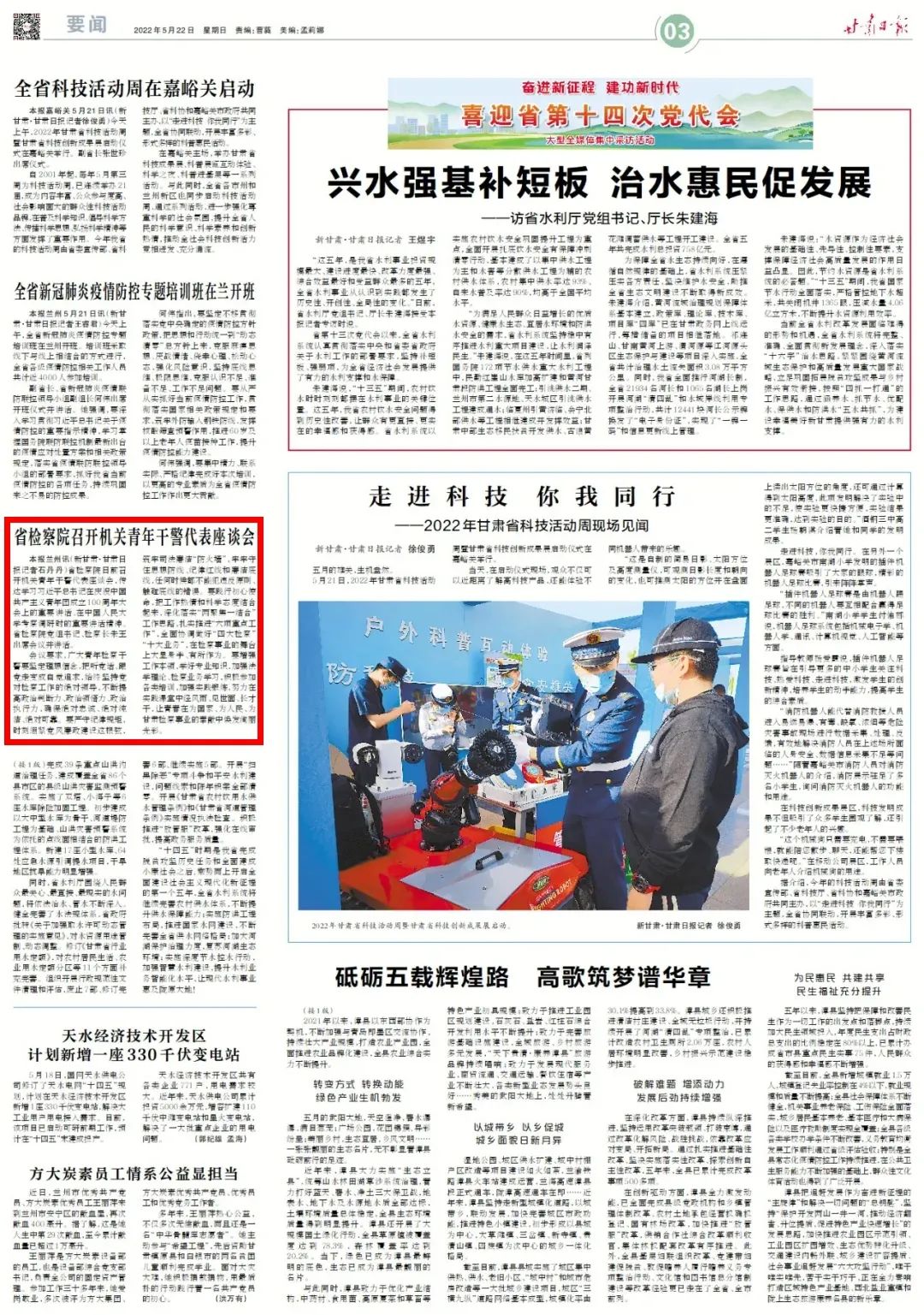 2022年5月22日,甘肃日报三版刊发《省检察院召开机关青年干警代表座谈会》。