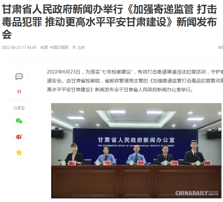 2022年6月23日,中国日报网发布《甘肃省人民政府新闻办举行〈加强寄递监管 打击毒品犯罪 推动更高水平平安甘肃建设〉takse69新闻