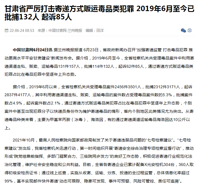 2022年6月24日,中国甘肃网发布《甘肃省严厉打击寄递方式贩运毒品类犯罪 2019年6月至今已批捕132人 起诉85人》。