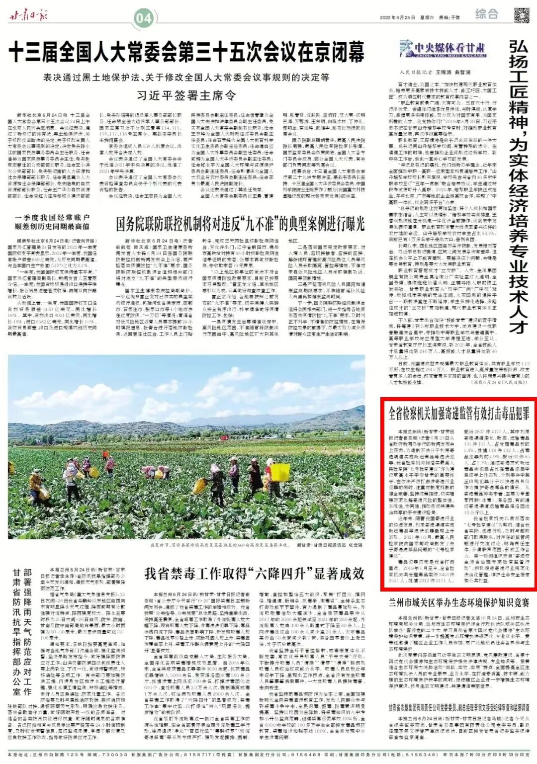 2022年6月25日,甘肃日报四版刊发《全省检察机关加强寄递监管有效打击毒品犯罪》。