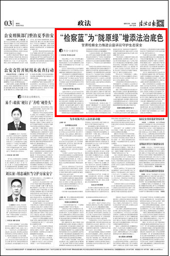 2022年7月6日,法治日报三版刊发《“检察蓝”为“陇原绿”增添法治底色——甘肃检察全力推进公益诉讼守护生态安全》。