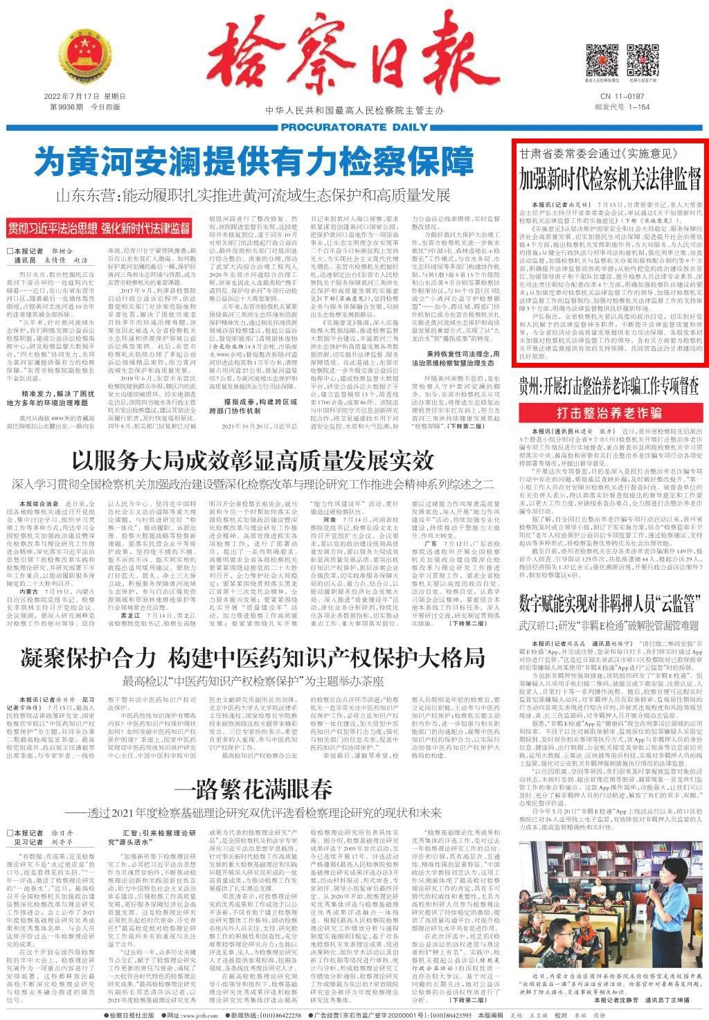 头版刊发《甘肃省委常委会通过〈实施意见〉加强新时代检察机关法律监督》。