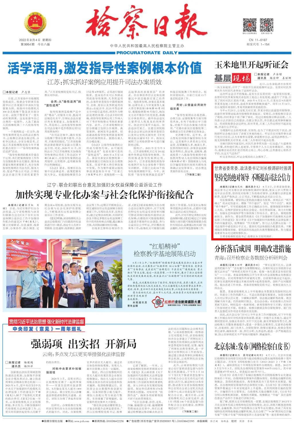 头版刊发《甘肃省委常委、政法委书记刘长根调研时强调:坚持党的绝对领导 不断提高司法公信力》。