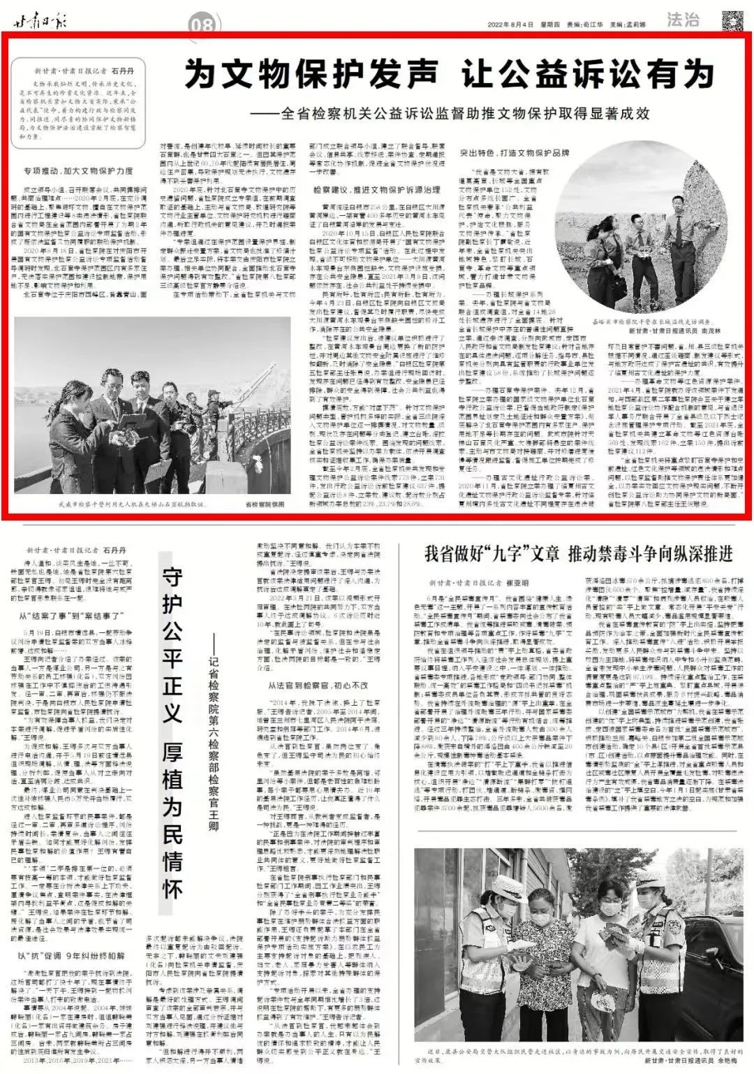 2022年8月4日,甘肃日报八版刊发《为文物保护发声 让公益诉讼有为——全省检察机关公益诉讼监督助推文物保护取得显著成效》。