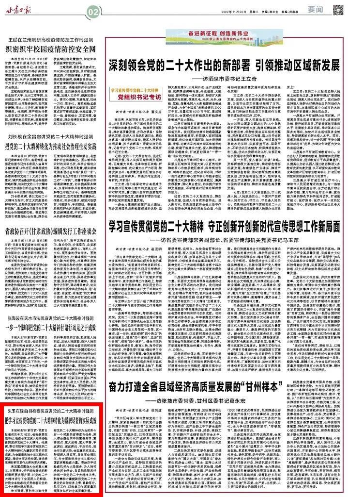 2022年11月22日,甘肃日报二版刊发《朱玉在碌曲县检察院宣讲党的二十大精神时强调 把学习宣传贯彻党的二十大精神转化为履职尽责的实际成效》。