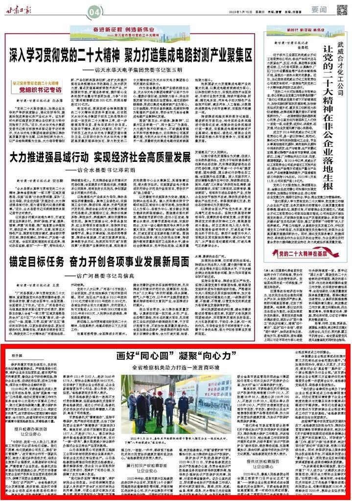 2023年1月15日,甘肃日报四版刊发《画好“同心圆” 凝聚“向心力”——全省检察机关助力打造一流营商环境》。