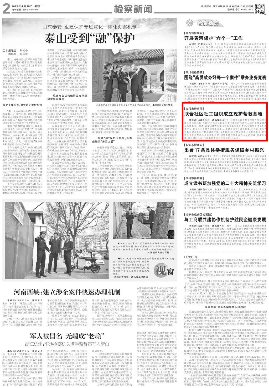 二版刊发《庆阳市检察院:联合社区社工组织成立观护帮教基地》。