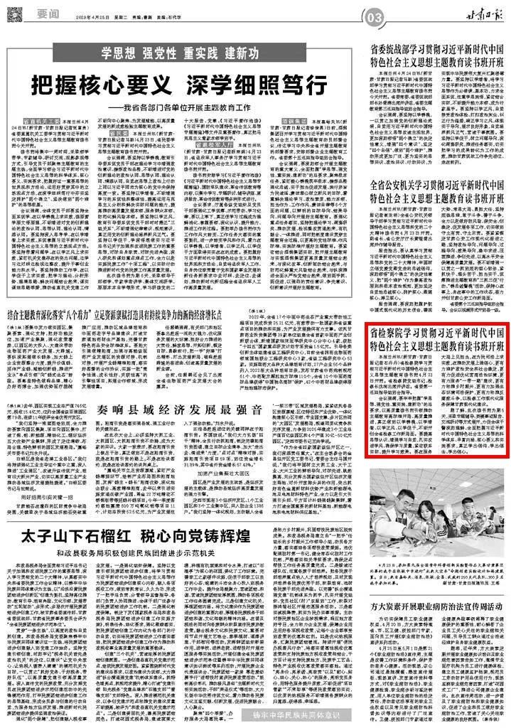 2023年4月25日,甘肃日报三版刊发《省检察院学习贯彻习近平新时代中国特色社会主义思想主题教育读书班开班》。