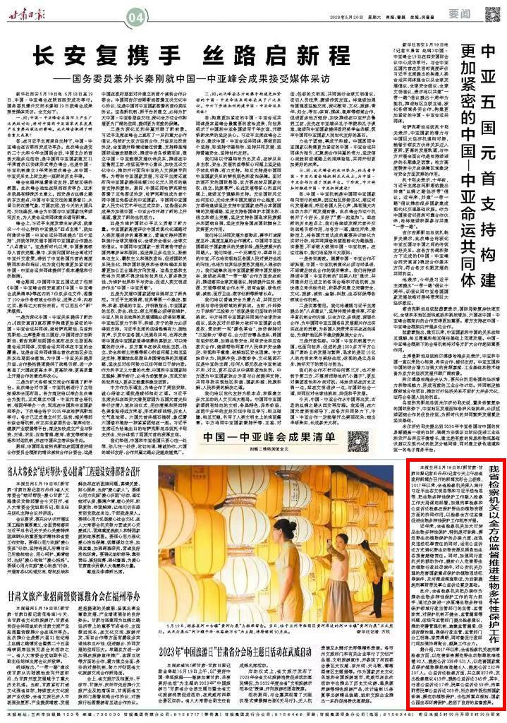 2023年5月20日,甘肃日报四版刊发《我省检察机关以全方位监督推进生物多样性保护工作》。