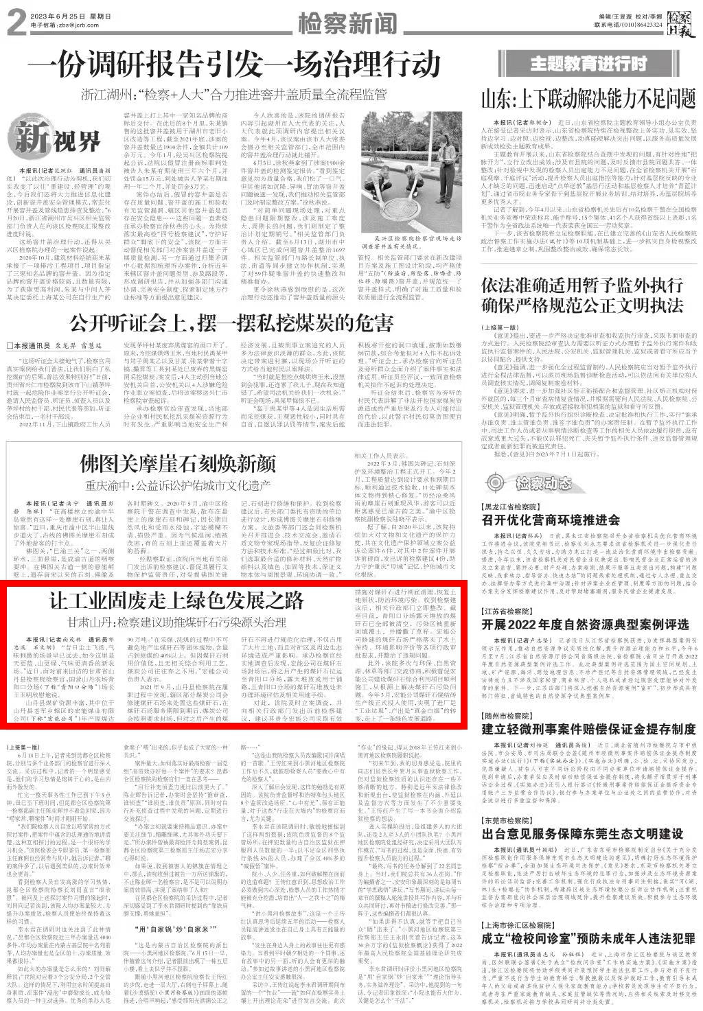 二版刊发《让工业固废走上绿色发展之路——甘肃山丹:检察建议助推煤矸石污染源头治理》。