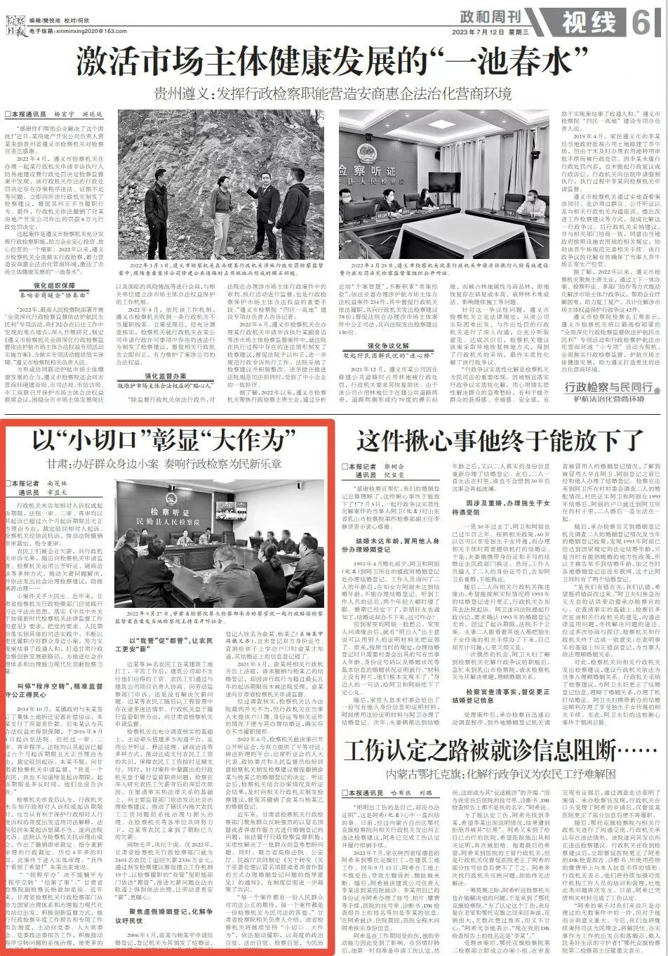 政和周刊刊发《以“小切口”彰显“大作为”——甘肃:办好群众身边小案 奏响行政检察为民新乐章》。