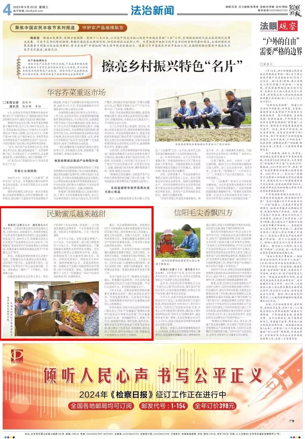 自今年6月起,该院从蜜瓜种植户、生产企业、行业监管者、线上线下销售者四个主体入手,开展实地调研走访,了解民勤蜜瓜地理标志保护的有关情况,并在地理标志使用企业调取相关申请、授权、管理制度等工作台账资料200余份,同时,对种质资源保护、种植技术专利申请、独特种植模式认证、质量监督和控制、地理标志产品群众知晓度等内容开展线上线下问卷调查。据此,民勤县检察院撰写了《关于“民勤蜜瓜”知识产权保护及检察思考》的调研报告。