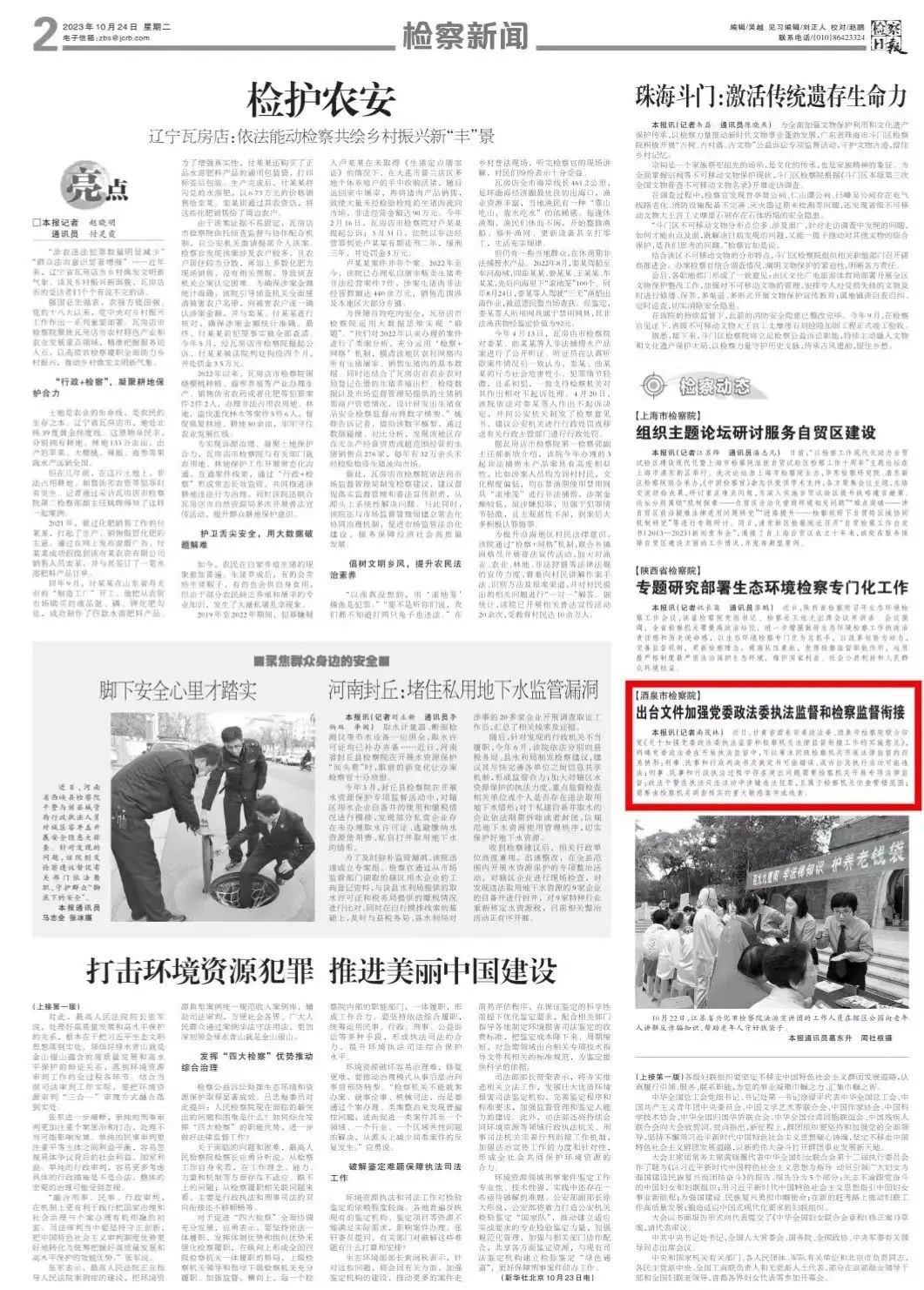 刊发《甘肃酒泉:出台文件加强党委政法委执法监督和检察监督衔接》。