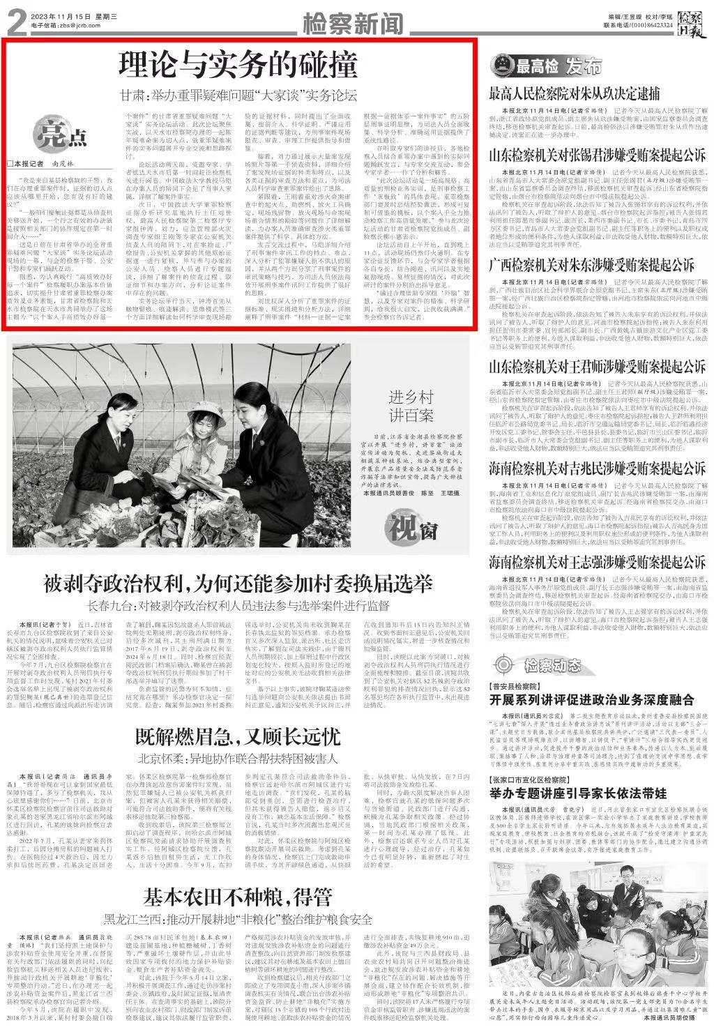 二版头条刊发《理论与实务的碰撞——甘肃:举办重罪疑难问题“大家谈”实务论坛》。