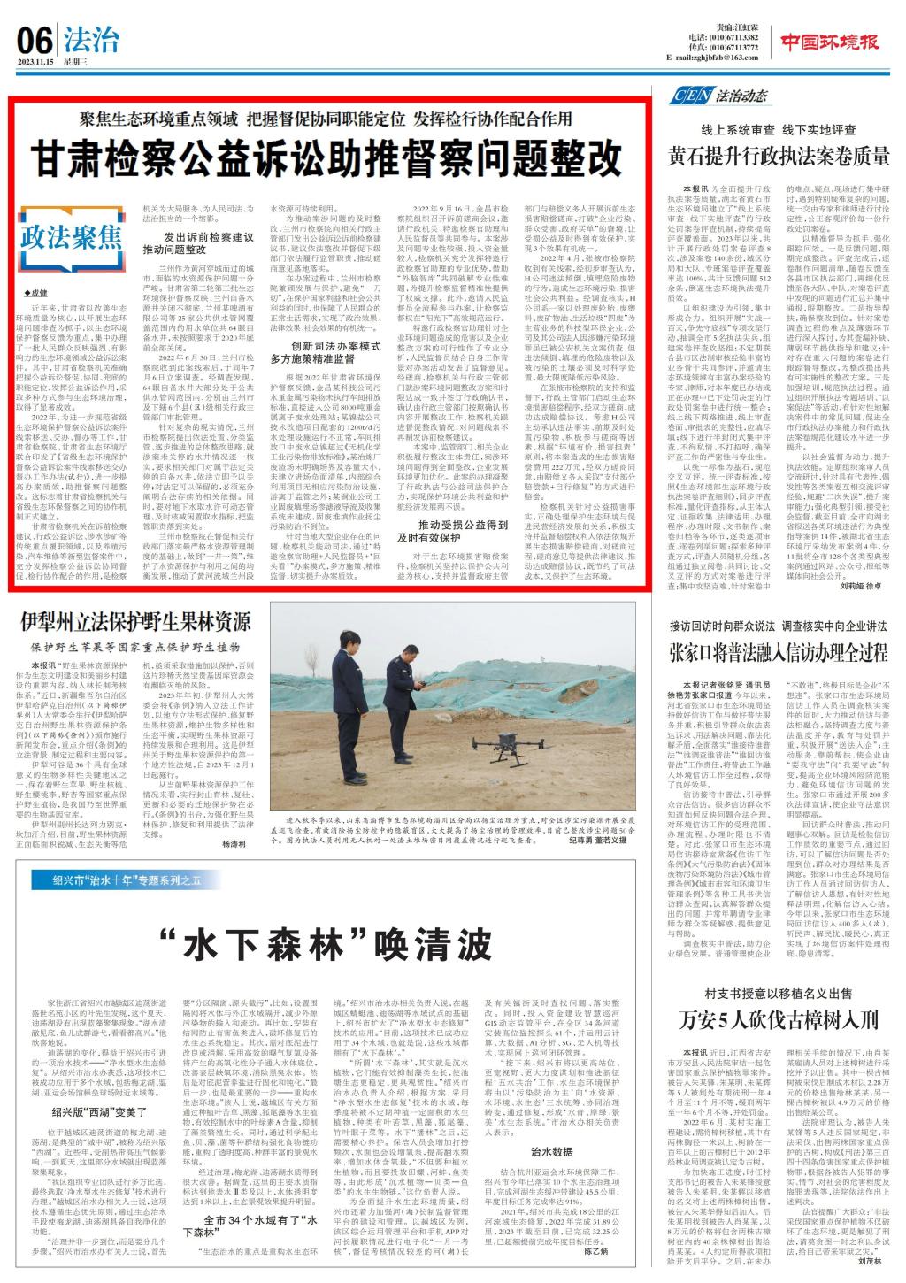 2023年11月15日,中国环境报刊发《甘肃检察公益诉讼助推督察问题整改——聚焦生态环境重点领域 把握督促协同职能定位 发挥检行协作配合作用》。