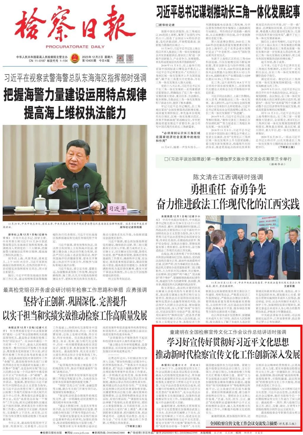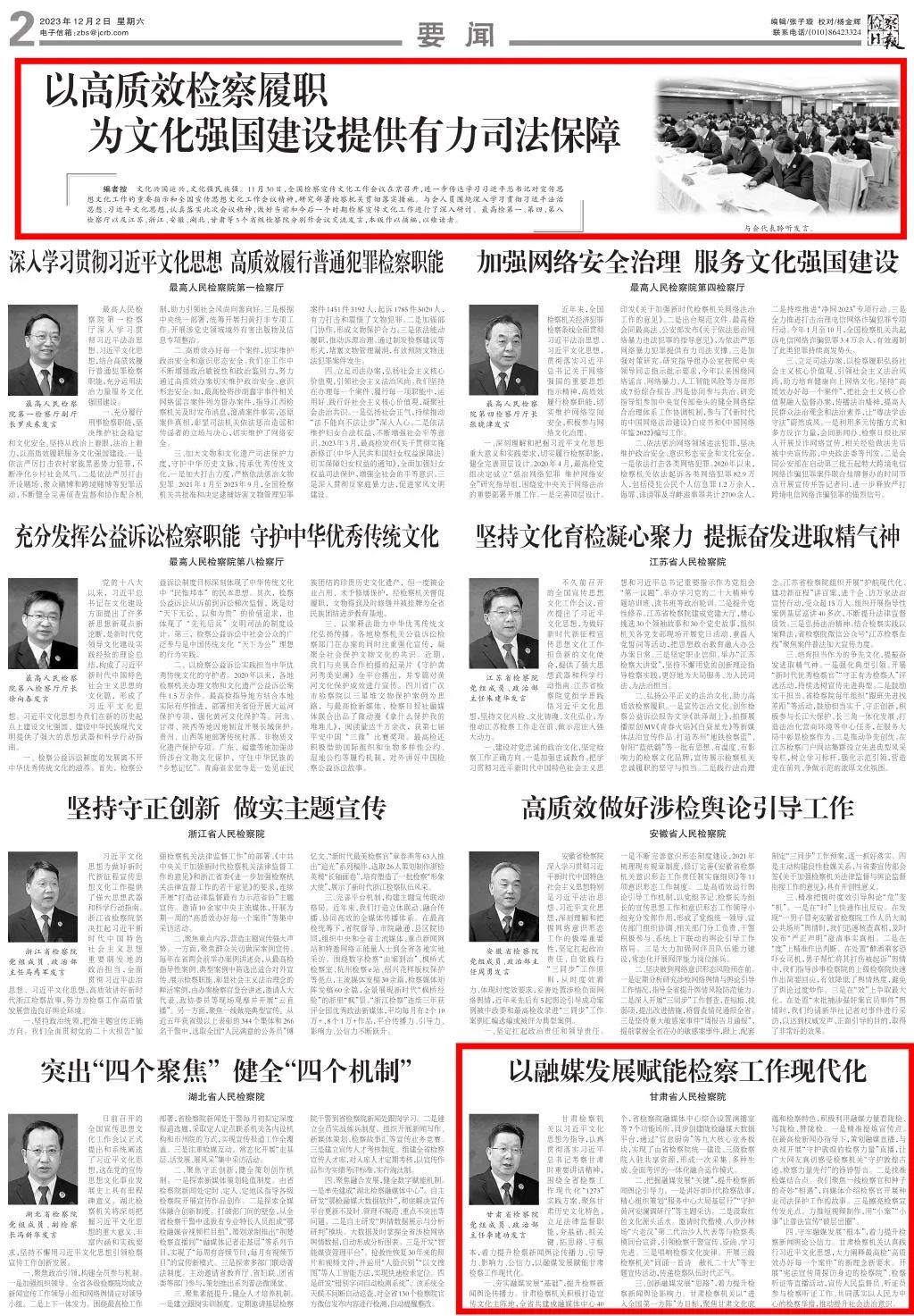 刊发《以高质效检察履职 为文化强国建设提供有力司法保障》,刊载全国检察宣传文化工作会议交流发言摘要。