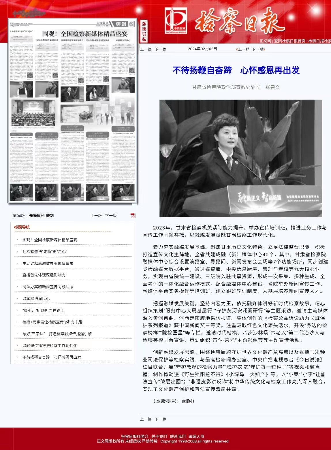 2024年2月2日,takse69 先锋周刊刊发takse69政治部宣教处在检察新媒体创新发展研讨会暨2023年度全国检察新媒体精品展示活动上的交流发言《不待扬鞭自奋蹄 心怀感恩再出发》。