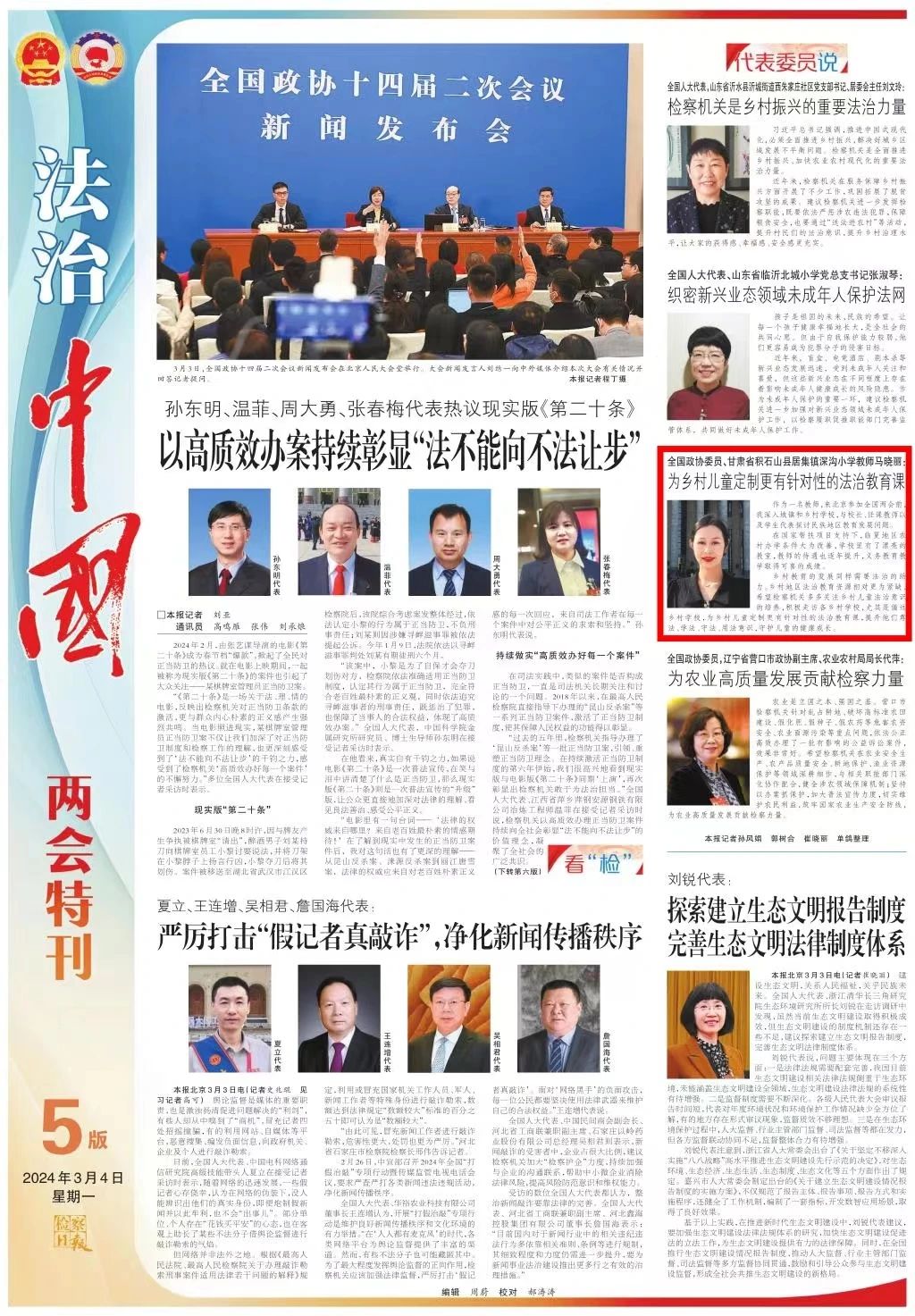 两会特刊刊发《全国政协委员、甘肃省积石山县居集镇深沟小学教师马晓丽:为乡村儿童定制更有针对性的法治教育课》。