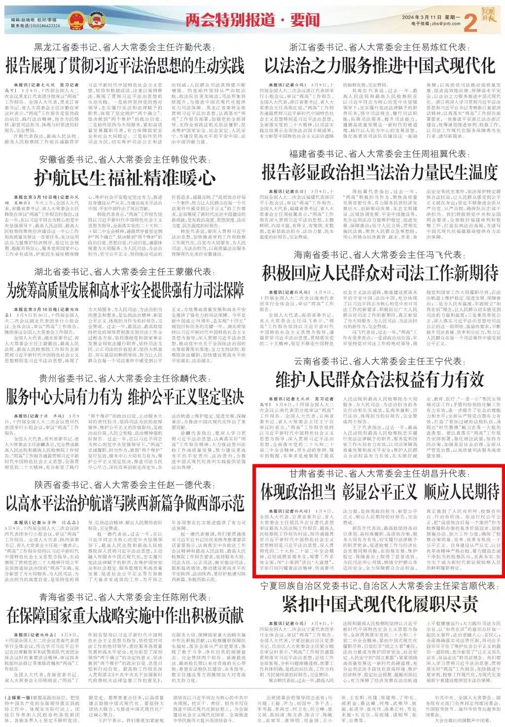 两会特别报道·要闻刊发《甘肃省委书记、省人大常委会主任胡昌升代表:体现政治担当 彰显公平正义 顺应人民期待》。