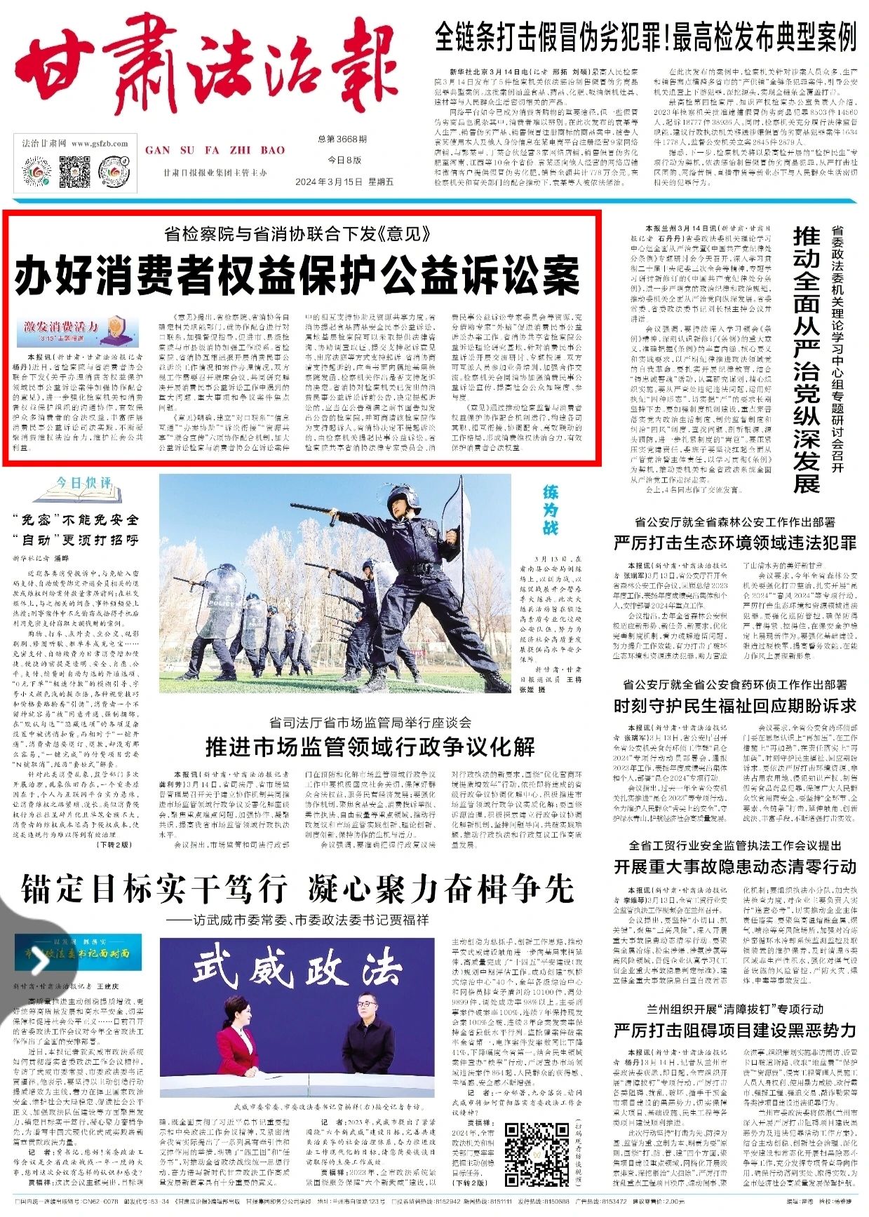 2024年3月15日,甘肃法治报头版头条刊发《省检察院与省消协联合下发〈意见〉办好消费者权益保护公益诉讼案》。