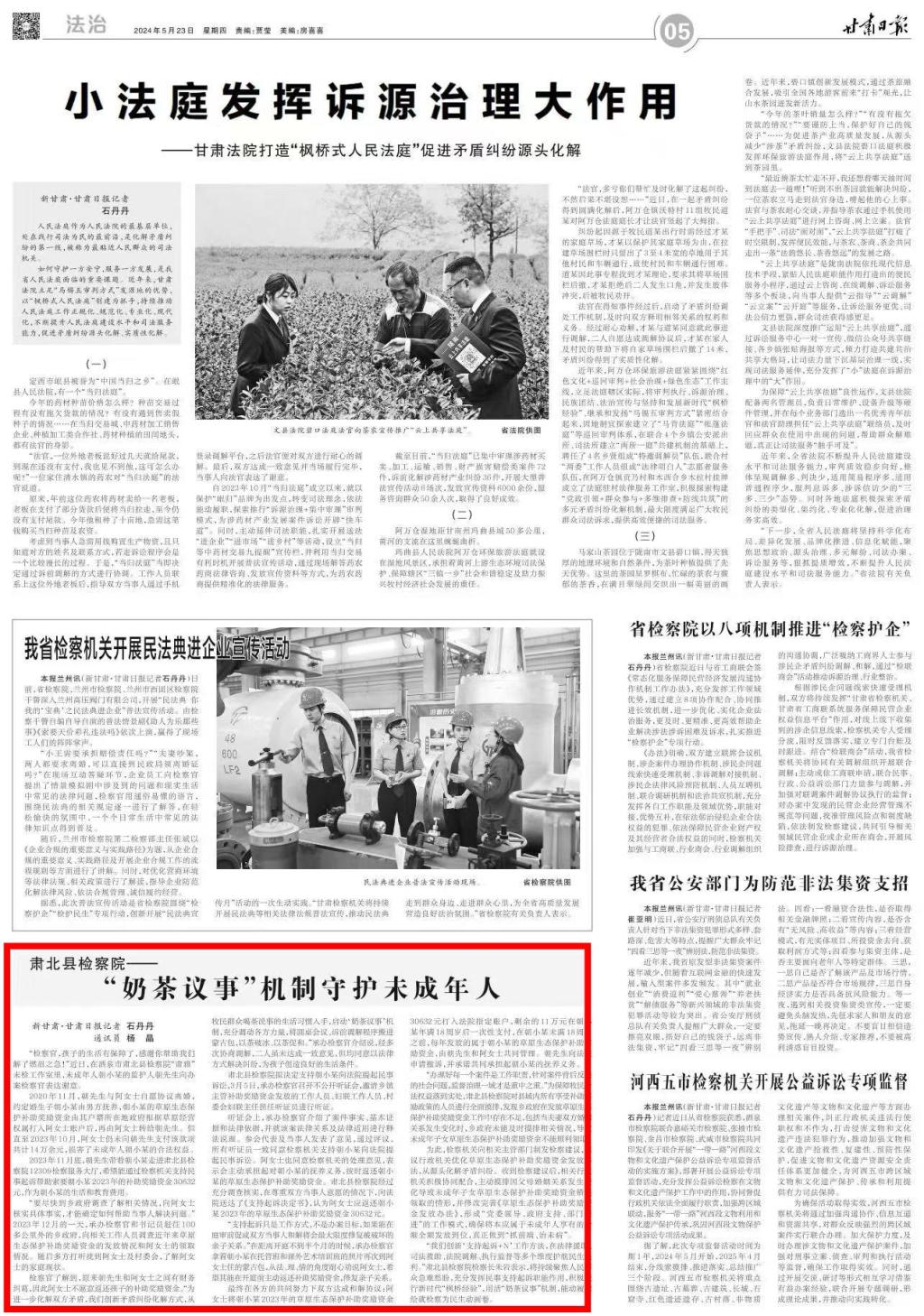 2024年5月23日,甘肃日报刊发《肃北县检察院:“奶茶议事”机制守护小小少年》。