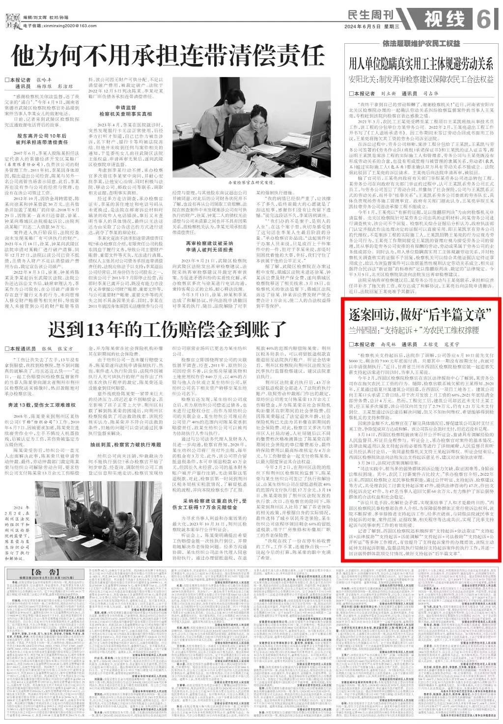 民生周刊刊发《逐案回访,做好“后半篇文章”——兰州西固:“支持起诉+”为农民工维权撑腰》。