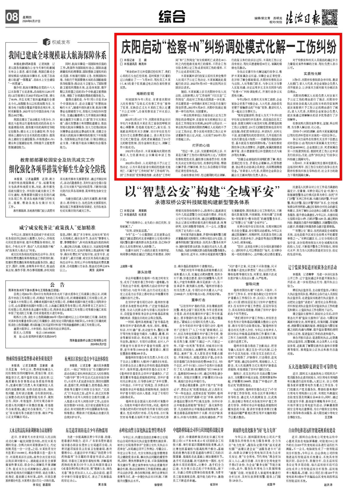 2024年6月27日,法治日报刊发《庆阳启动“检察+N”纠纷调处模式化解一工伤纠纷》。