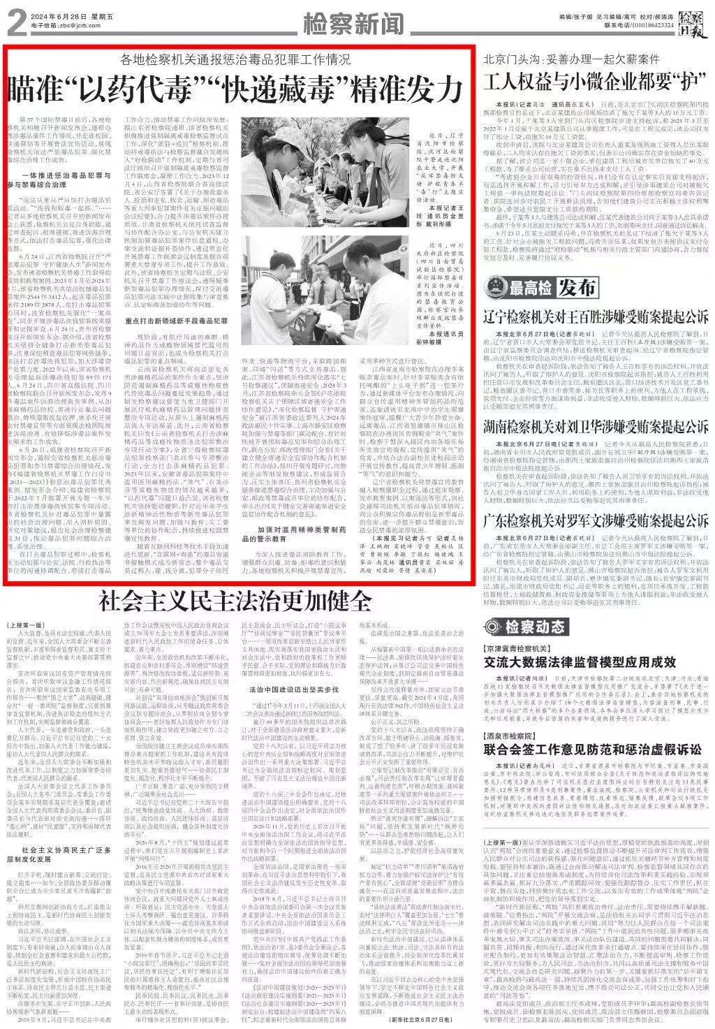 刊发《各地检察机关通报惩治毒品犯罪工作情况——瞄准“以药代毒”“快递藏毒”精准发力》。