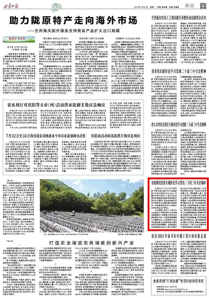 2024年7月23日,甘肃日报刊发《省检察院党组专题传达学习党的二十届三中全会精神》。
