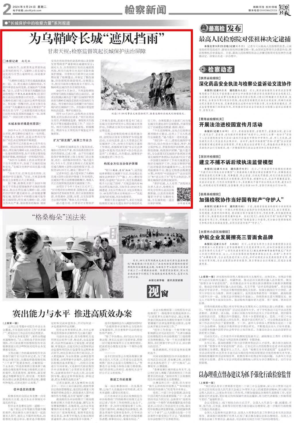 二版头条刊发《为乌鞘岭长城“遮风挡雨”——甘肃天祝:检察监督筑起长城保护法治屏障》。