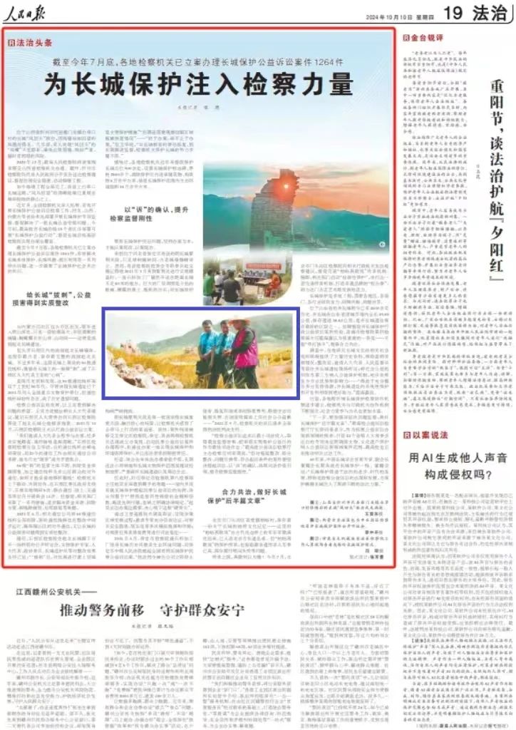 2024年10月10日,人民日报法治头条《为长城保护注入检察力量》通讯稿中刊发新闻图片《甘肃省天祝藏族自治县检察院工作人员现场查看乌鞘岭长城保护情况》。