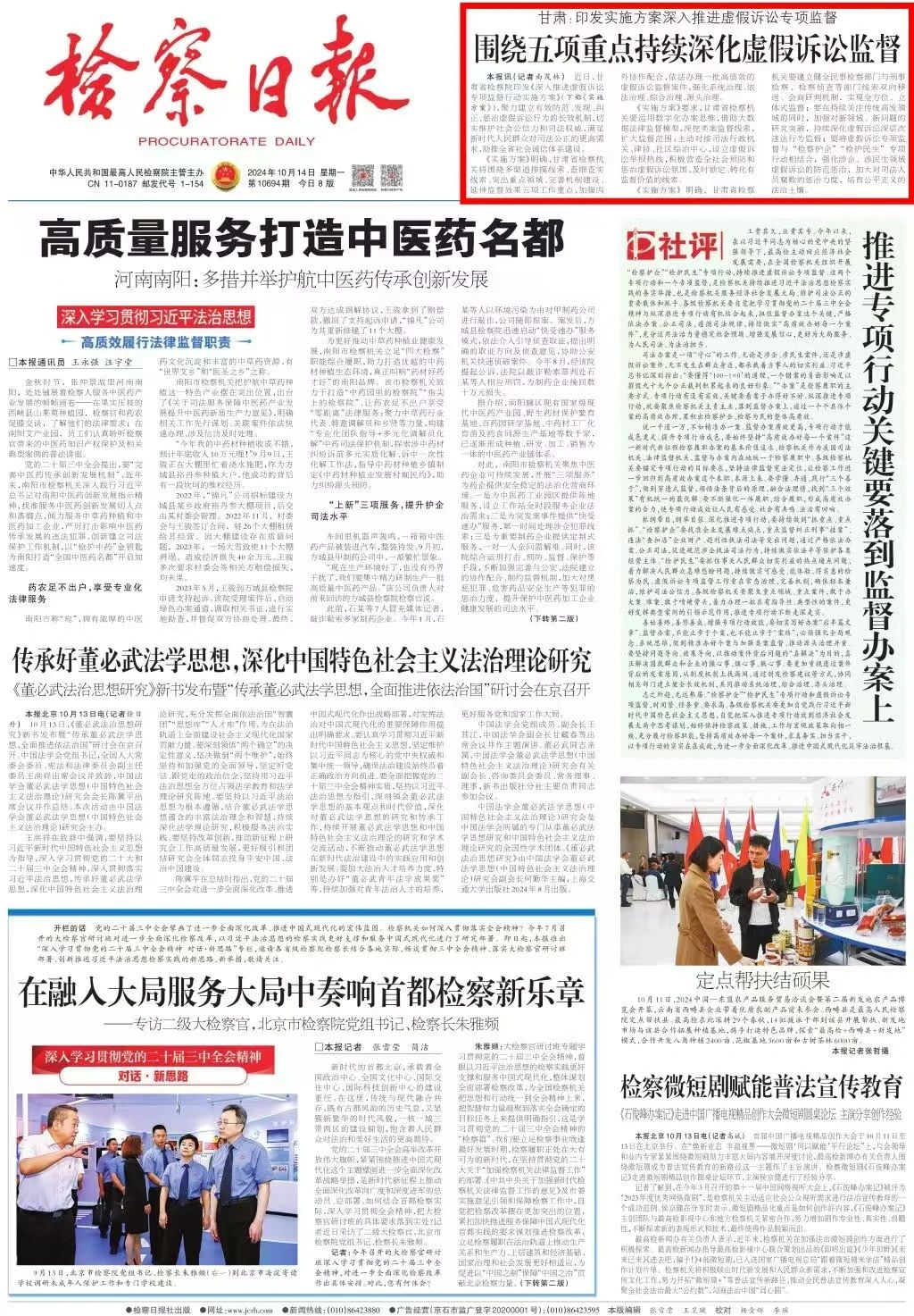 头版刊发《甘肃:印发实施方案深入推进虚假诉讼专项监督——围绕五项重点持续深化虚假诉讼监督》。