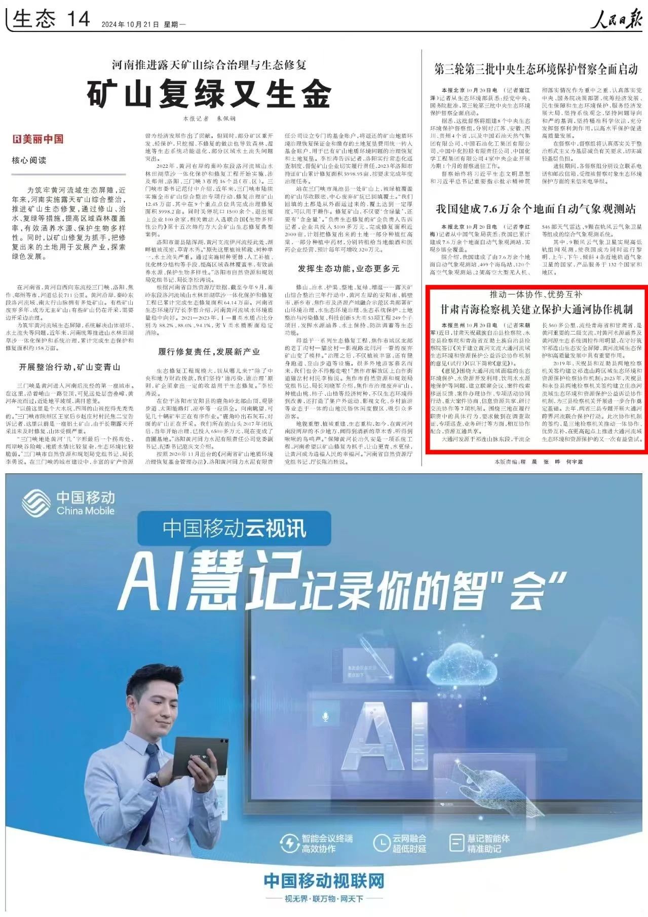 2024年10月21日,人民日报刊发《推动一体协作、优势互补——甘肃青海检察机关建立保护大通河协作机制》。