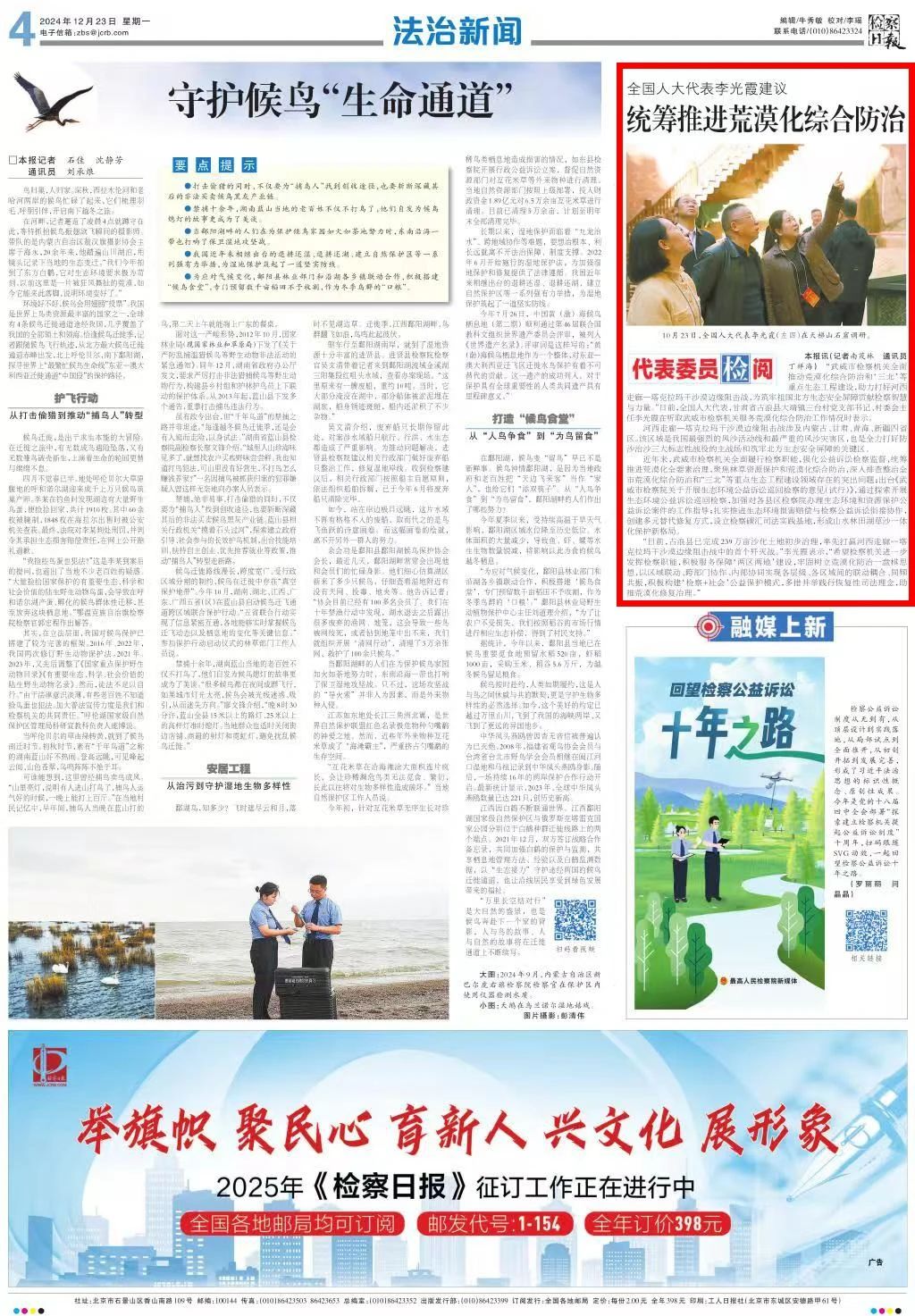 代表委员检阅栏目刊发《全国人大代表李光霞建议:统筹推进荒漠化综合防治》。