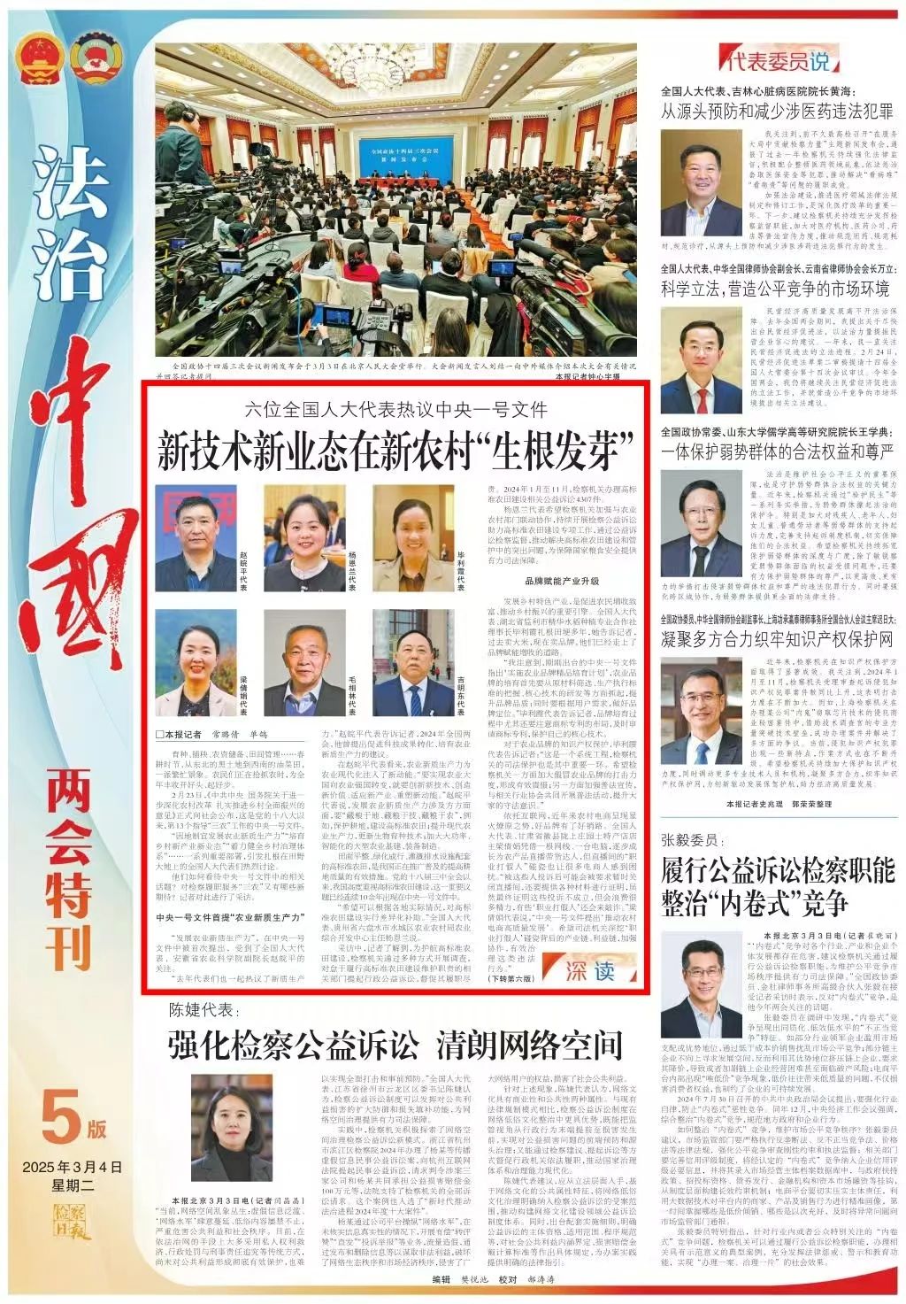 《法治中国两会特刊》专栏刊发《六位全国人大代表热议中央一号文件:新技术新业态在新农村“生根发芽”》。