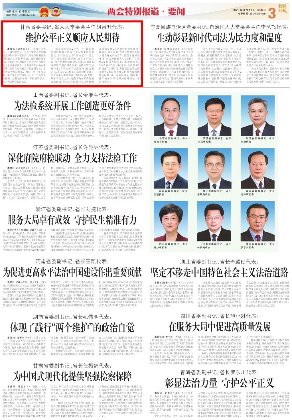 头版《两会特别报道·要闻》专栏刊发《甘肃省委书记、省人大常委会主任胡昌升代表:维护公平正义顺应人民期待》。