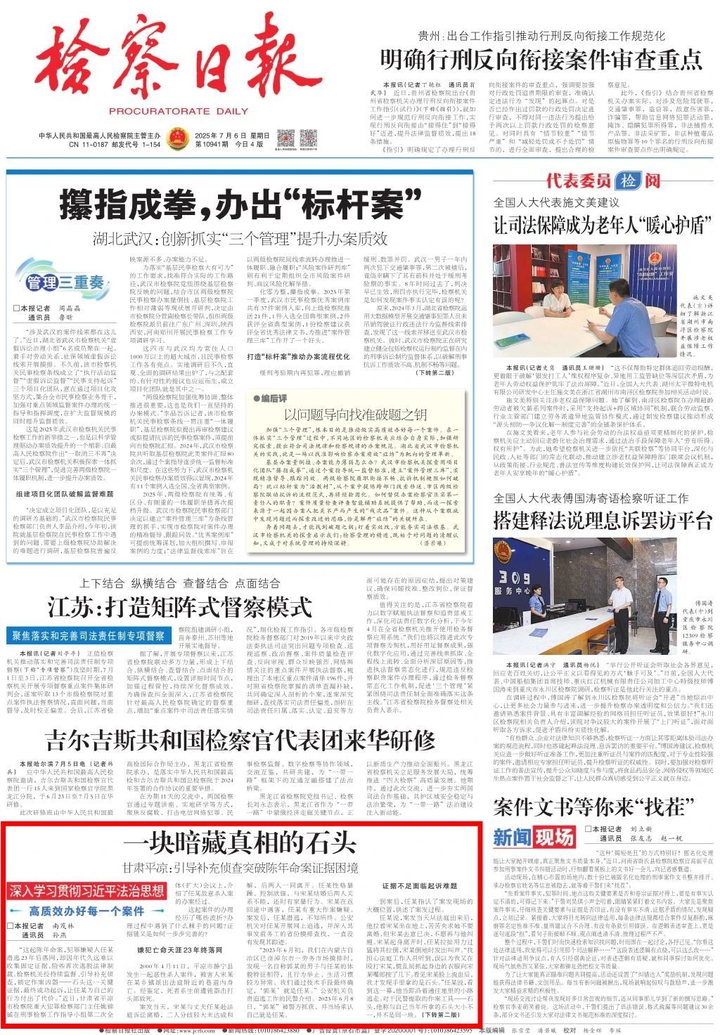 头版刊发《一块暗藏真相的石头——甘肃平凉:引导补充侦查突破陈年命案证据困境》。