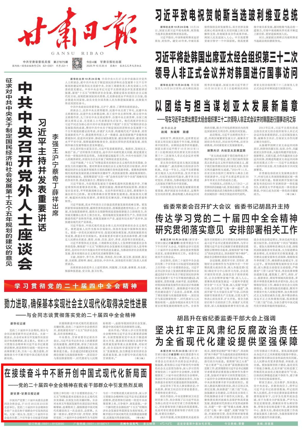 2025年10月25日,甘肃日报头版刊发《在接续奋斗中不断开创中国式现代化新局面——党的二十届四中全会精神在我省干部群众中引发热烈反响》。