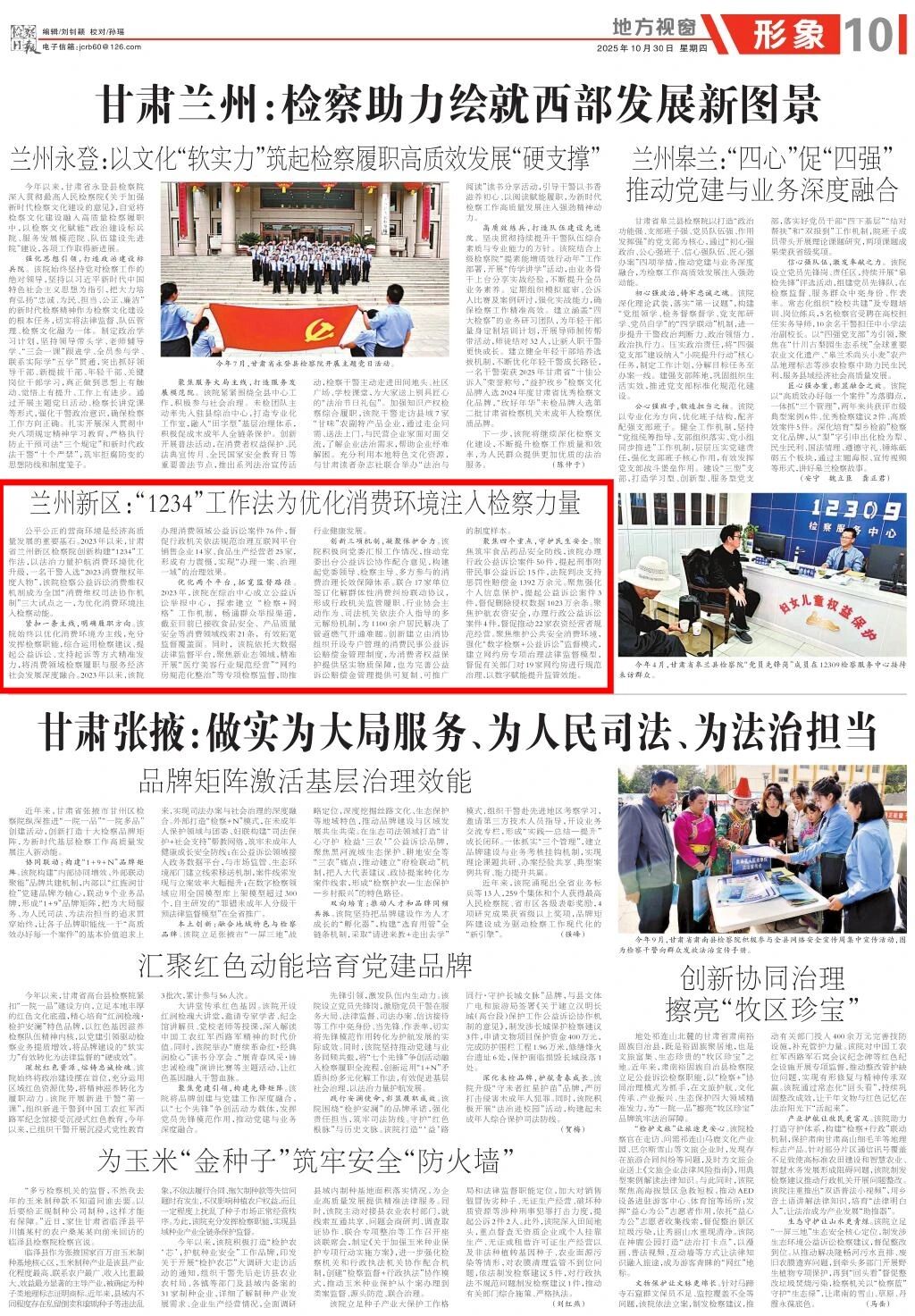 地方视窗《甘肃兰州:检察助力绘就西部发展新图景》专版刊发《兰州新区:“1234”工作法为优化消费环境注入检察力量》。
