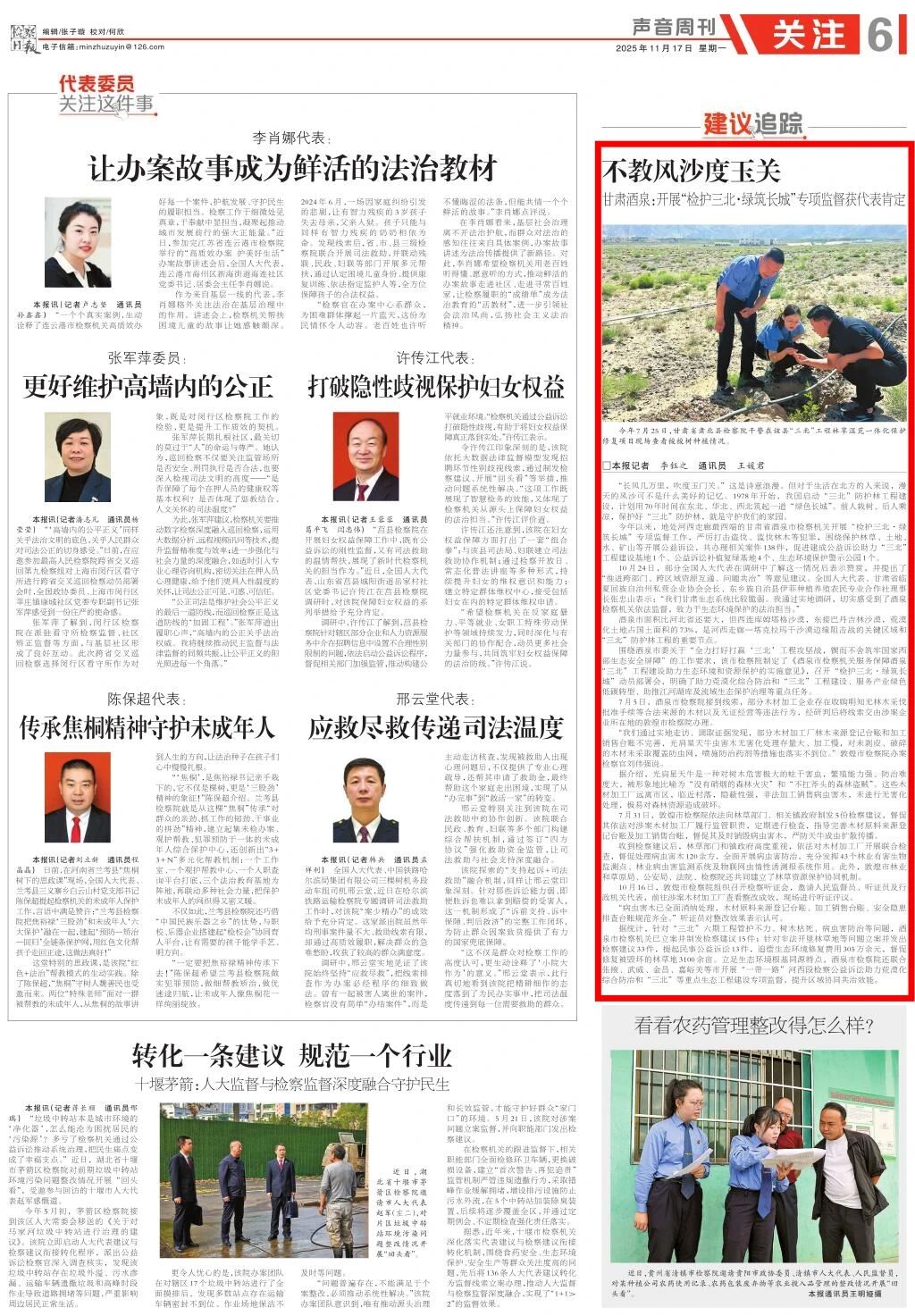 声音周刊刊发《不教风沙度玉关 甘肃酒泉:开展“检护三北·绿筑长城”专项监督获代表肯定》。