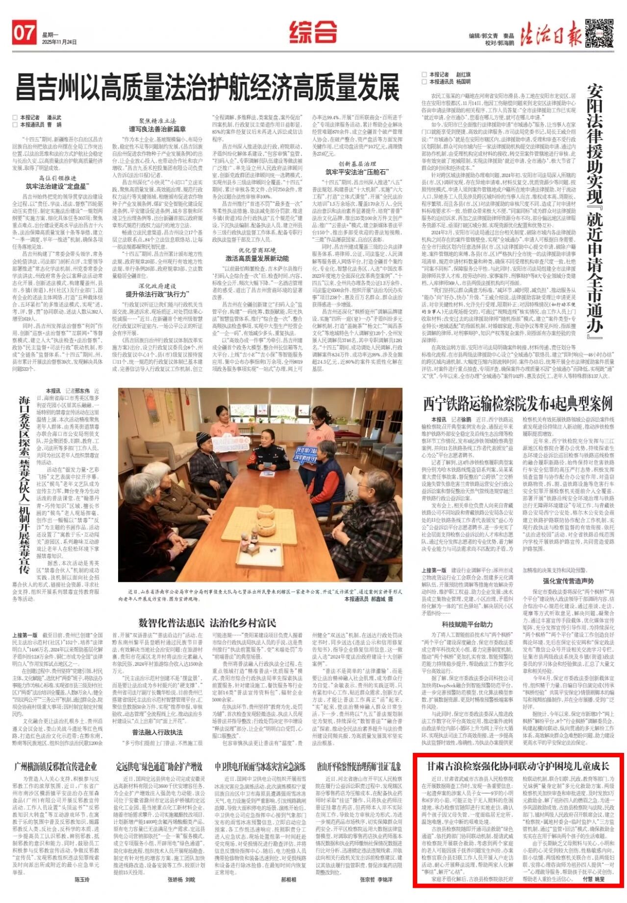 2025年11月24日,法治日报刊发《甘肃古浪检察强化协同联动守护困境儿童成长》。