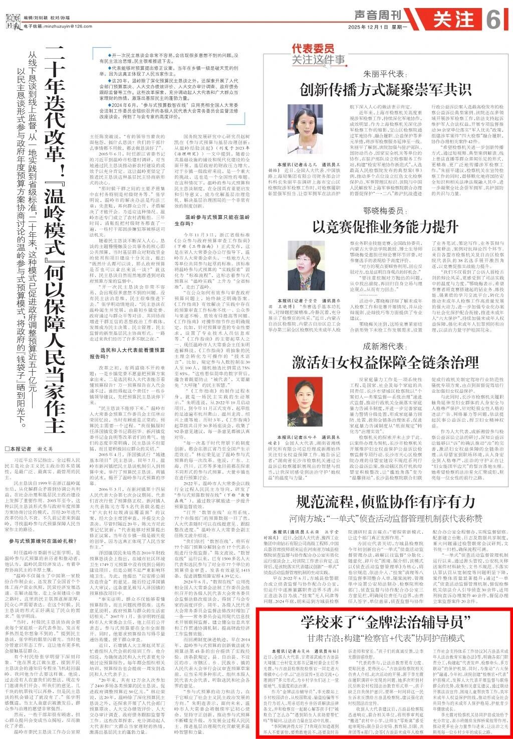 声音周刊刊发《学校来了“金牌法治辅导员”——甘肃古浪:构建“检察官+代表”协同护苗模式》。