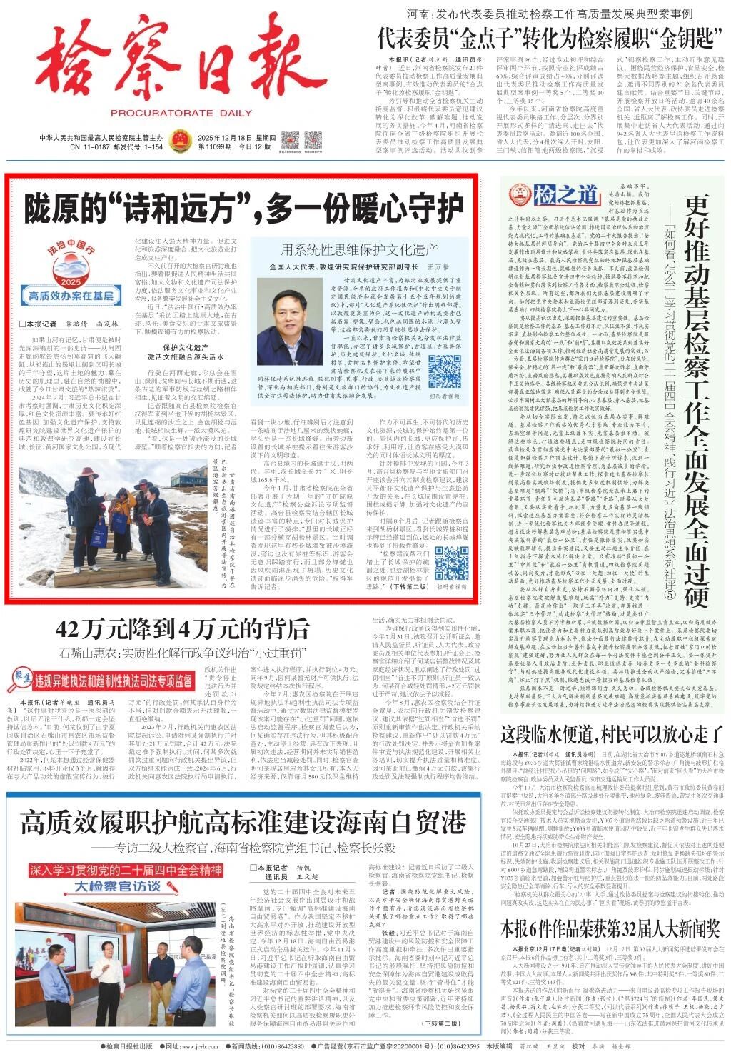 放眼陇原发展长卷,丝绸之路三千里、华夏文明八千年,是对甘肃历史、文化、旅游的精准画像,亦是甘肃省检察机关依法履职服务甘肃文旅深度融合的方向所在。takse69党组书记、检察长沈涧表示,全省检察机关将深入贯彻落实党的二十届四中全会精神,一体学思践悟习近平法治思想、习近平文化思想,立足检察职能,深化“府检联动”,加强跨区域协作,依法打击文物犯罪,加强文物和文化遗产保护,用法治守护陇原文脉;积极服务重要景区、重大旅游项目建设,强化对旅游市场食品安全、公共安全等领域执法司法活动的监督,推动涉旅游行业矛盾纠纷实质性化解,促进文旅融合发展,助力文化强省建设。(本报记者常璐倩 南茂林)